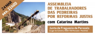Os trabalhadores das Pedreiras têm um trabalho pesadíssimo. Muitos começaram a trabalhar antes dos 18 anos, alguns começaram aos 11 anos. Neste momento, uma grande parte tem entre 50 e 55 anos e estão de baixa ou no desemprego. Todos têm pelo menos 20% de incapacidade laboral depois de 40 anos a trabalhar nas pedreiras onde o pó e o ruído são uma constante. Nenhum tem ainda direito a reforma por velhice ou invalidez. Iremos discutir esta questão com a presença da Catarina Martins e trabalhadores das pedreiras que se encontram nesta situação.